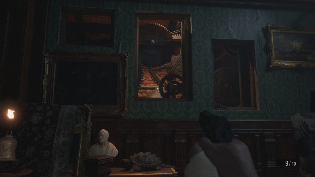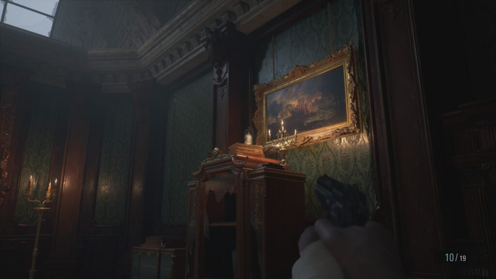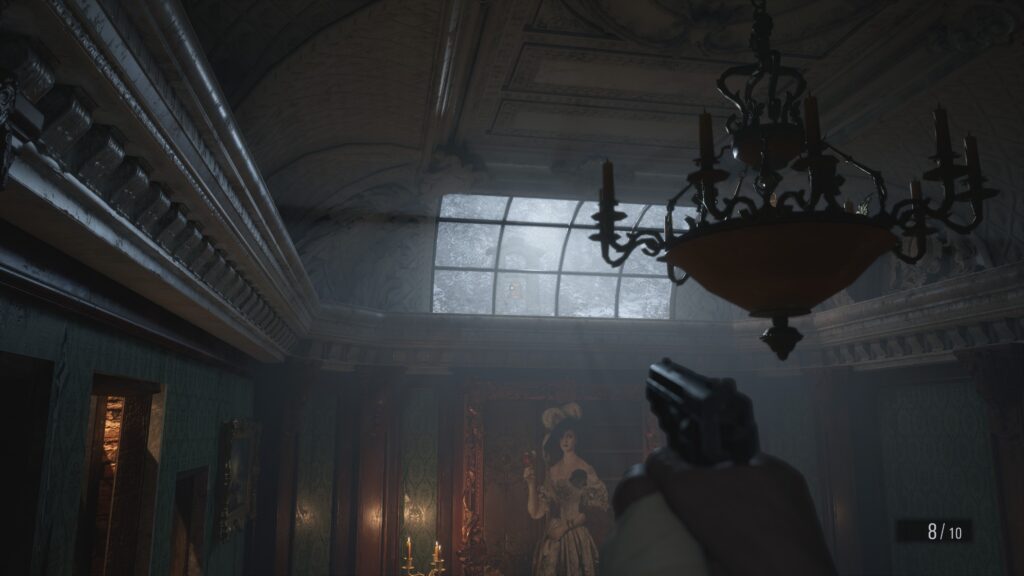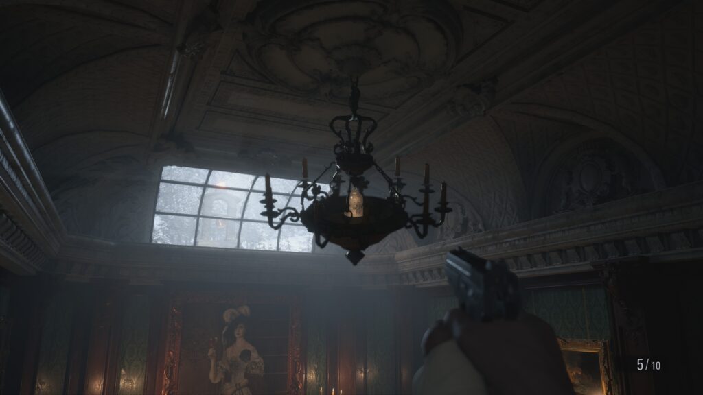 3. There’s a staircase that you ascend to. Go to it and look through the glass on top of Lady Dimitrescu’s painting. You will see a Bell outside of the art room. Shoot it.