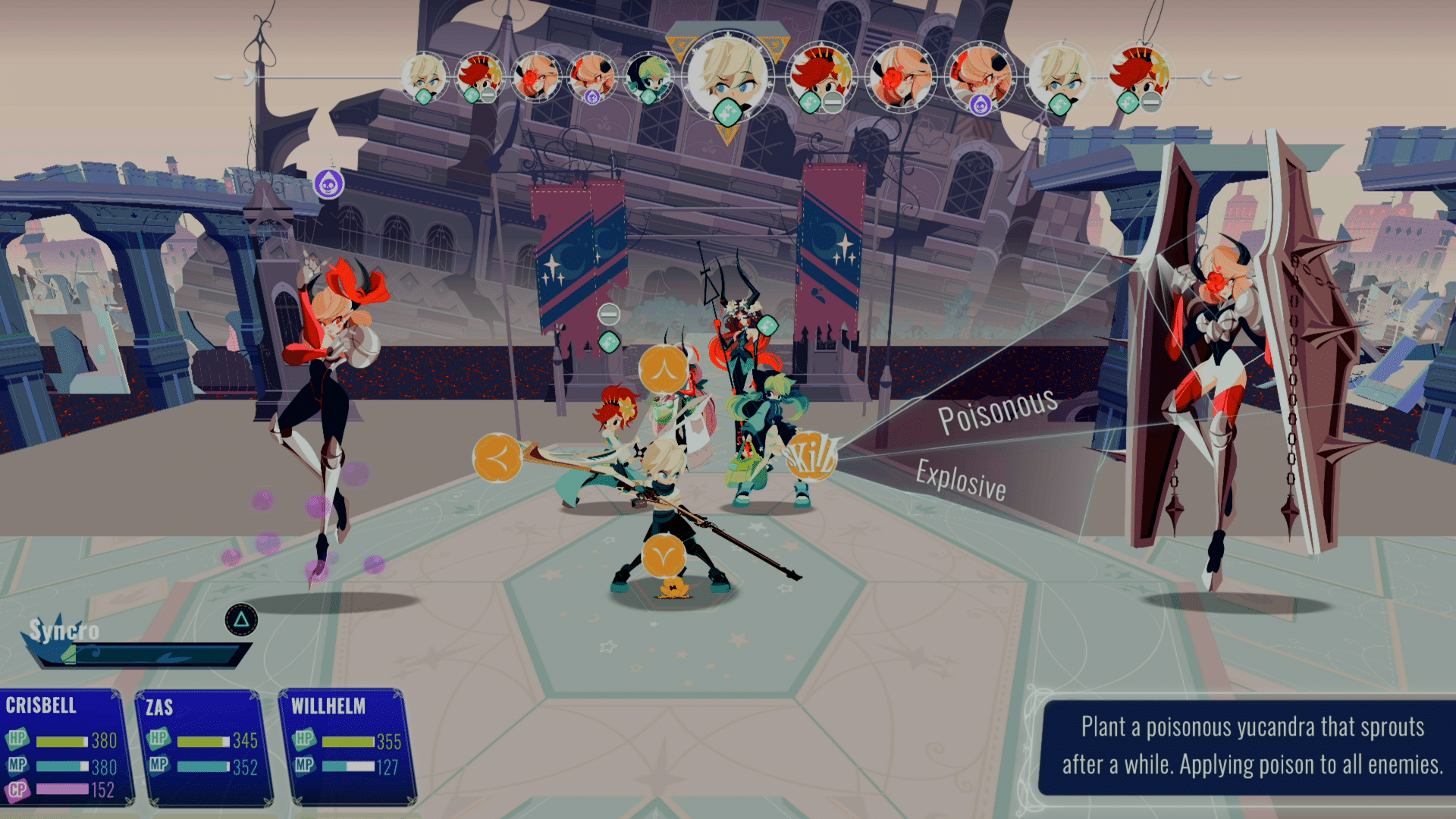 Start the fight doing some kind of physical attack. Whatever you do will be divided, though status aliments will be lost. On your first turn you want to have Willhelm poison Galley and use Crisbell’s turn to syncro poison Volcano. After both are poisoned, have Willhelm use restoring Yucandra and plant it. This needs to be your rotation on Willhelm at all times. Poison the girls, keep a heal in place, make sure everyone stays alive.