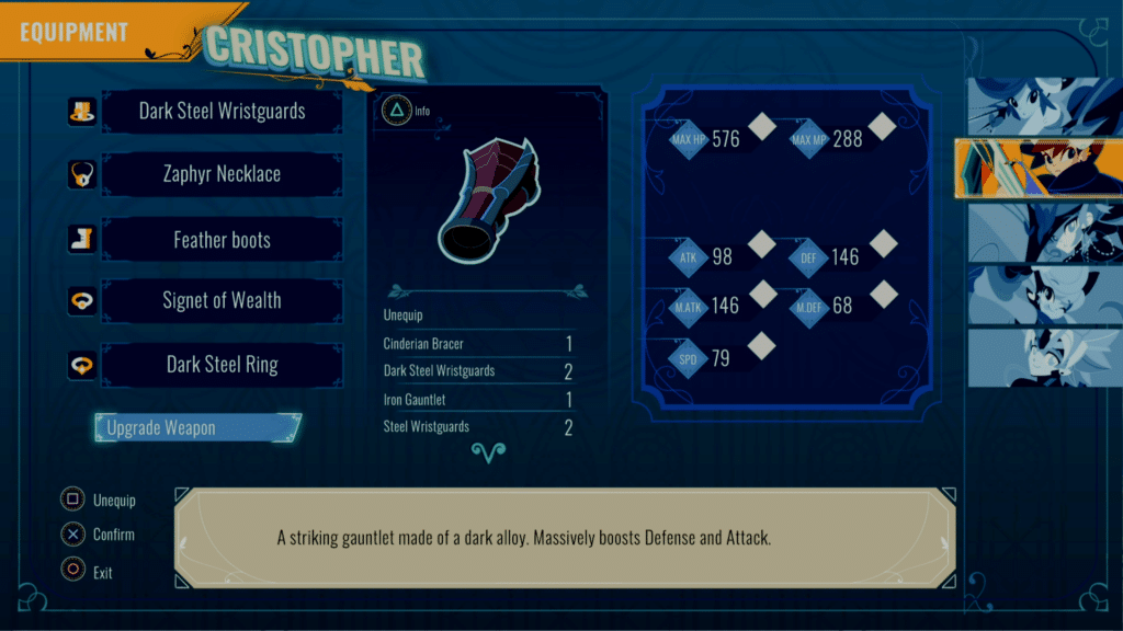 The rest of defense comes down to knowing her attacks. With the exception of one attack she rarely uses, the Time Empress will either use Time Compression, a skill that always drops everyone to a single hit point, Perfect Cure or one of the moves that inflict doom on someone. Cristopher has it in some of the images above, it’s the purple thing around him, which will kill him in three turns. In my experience, any time she inflicts doom on someone she will use Perfect Cure on the following turn so Crisbell can’t just remove it. I can also say blocking it wasn’t always successful at removing it, though it often helped.