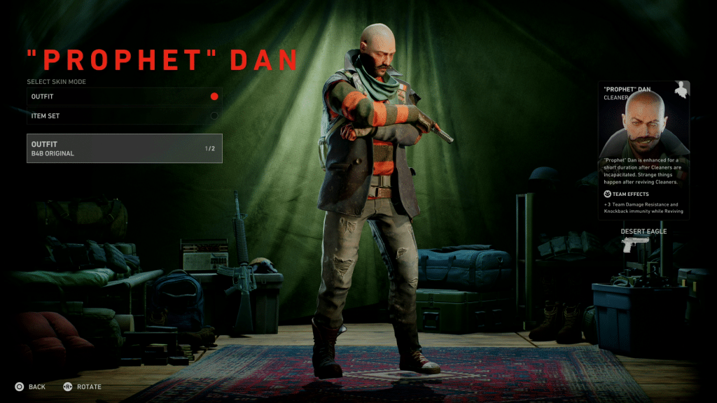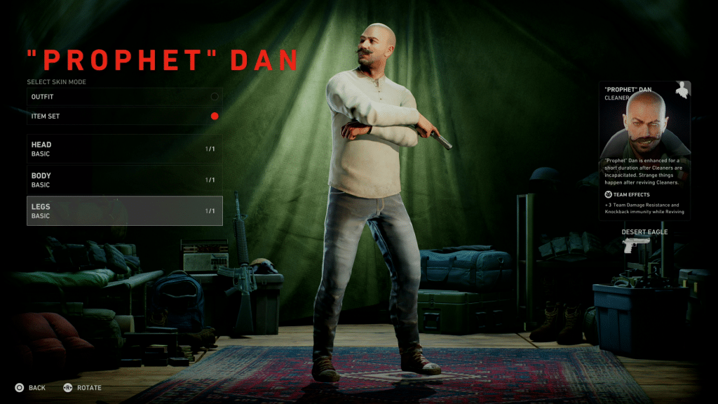That said, “Prophet” Dan comes off as a bit light next to the other Cleaners. With four total cosmetic items, two costumes (the other requiring 250 missions played as him), and a single item set, he has the least by a wide margin, falling behind even the newly added Heng/Sharice, who both received multiple costumes and item set pieces.