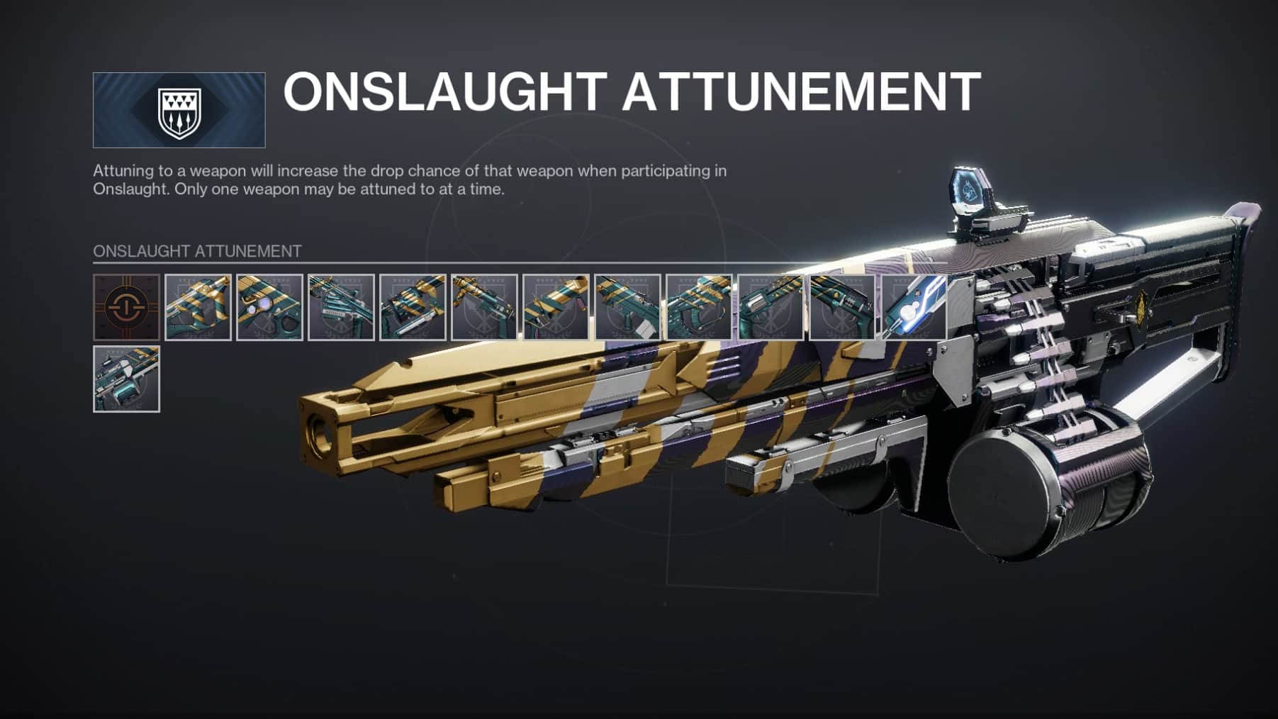 In Update 8.0.5, players can visit Zavala in the Tower to access a new Onslaught Attunement menu. From there, players can select a single BRAVE Arsenal weapon they’d like to attune to, increasing the drop chance by 60% in Onslaught. This is an increase from the 50% drop chance increase the Into the Light attunement system provided.