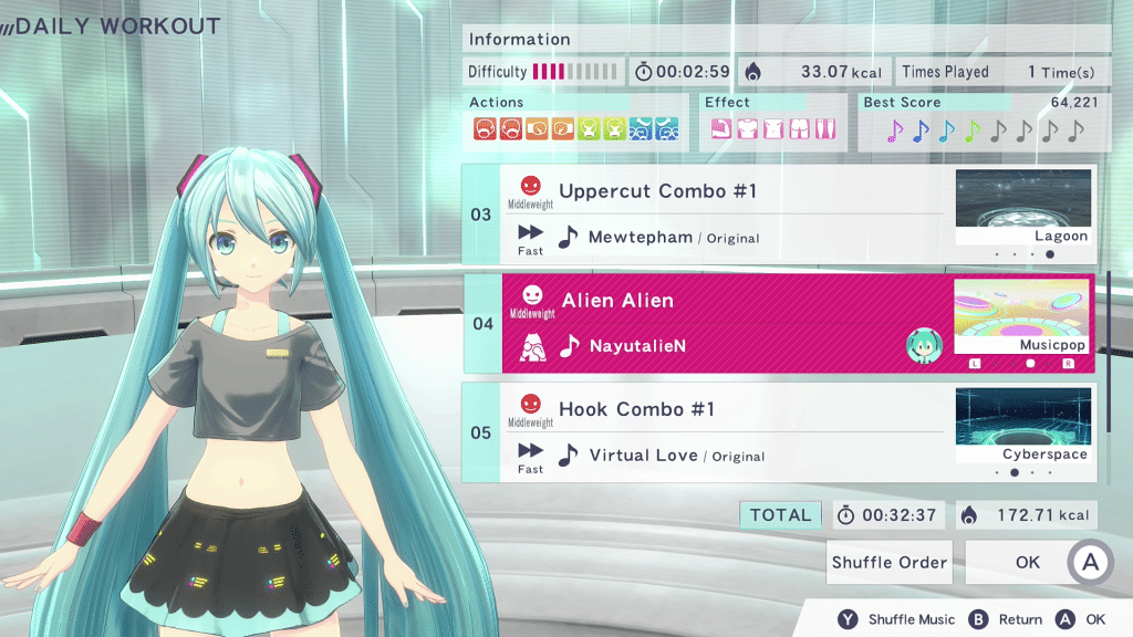 In Miku Exercise it’s much closer to her traditional rhythm games. Each song features a fixed routine at any of the three intensities, set to the beat of a handful of her famous songs. While several of my favorites did not make the list, the 20 or so that did are generally more noteworthy/popular.